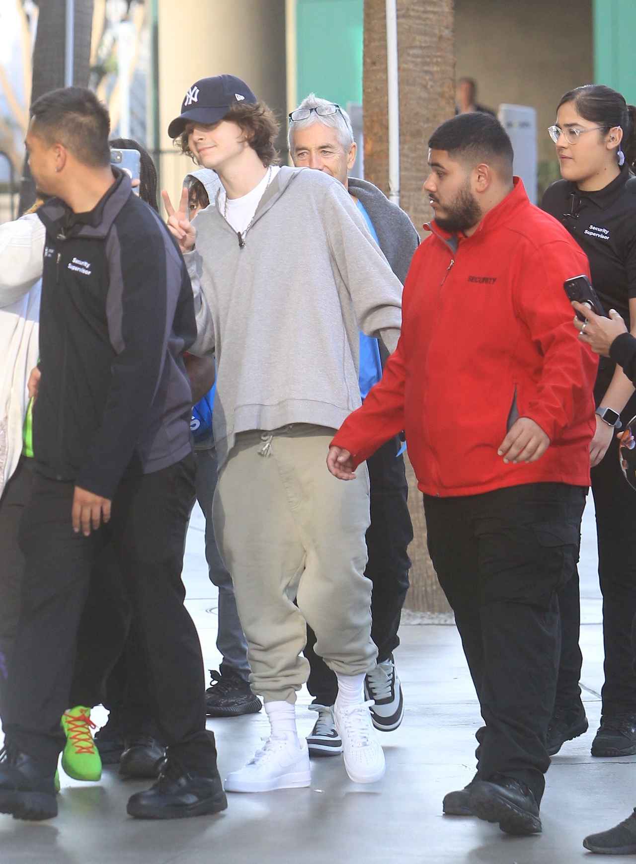 ファンから写真をお願いされ、カメラに向かってピースサインをするティモシー。