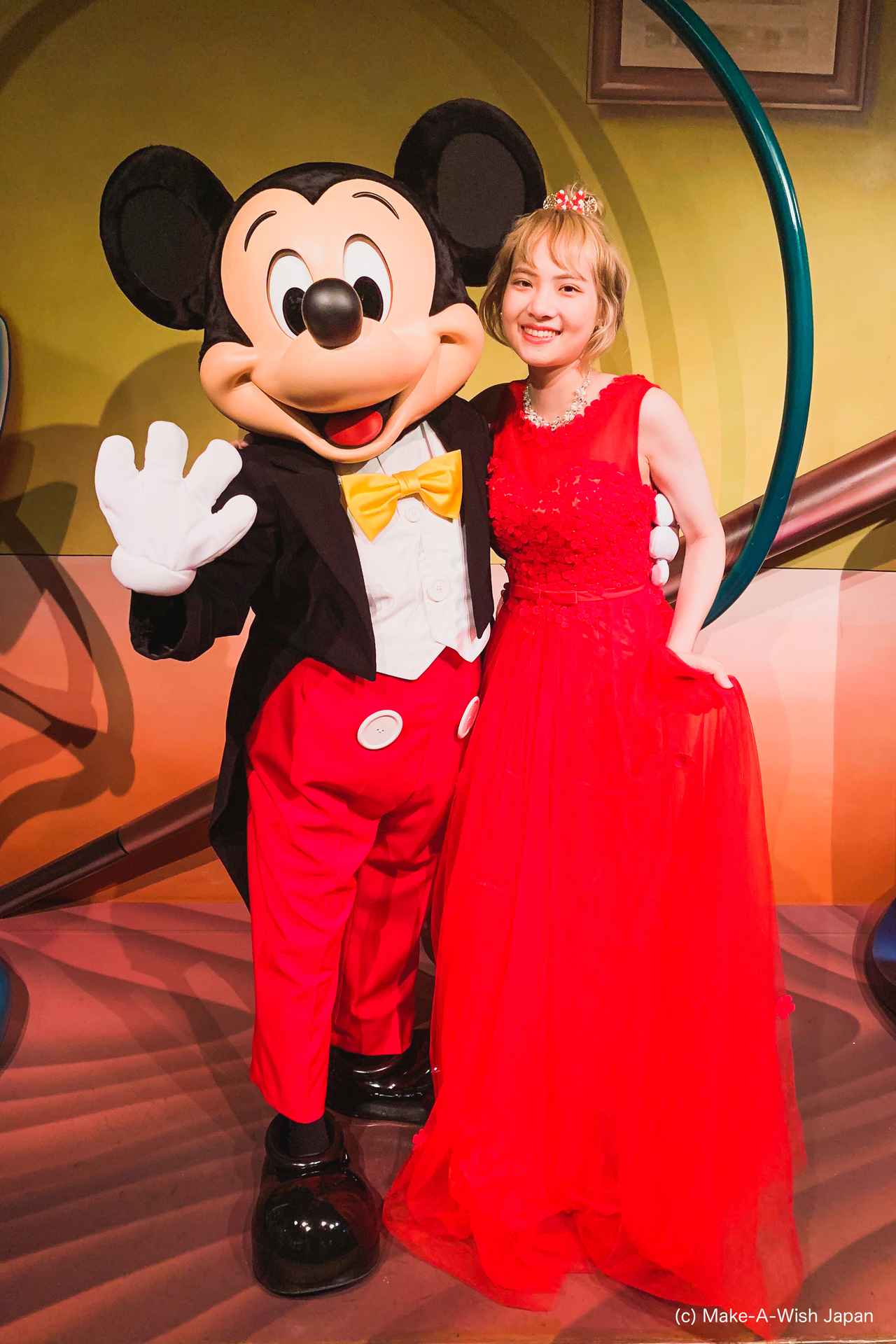 「赤いウエディングドレスを着てミッキーと写真を撮りたい!」という願いを叶えた夢華さん(18歳)。この日のためにドレスを準備し、「ミート・ミッキー」へ。ミッキーとの握手、キスやハグのプレゼント。夢の時間を心から楽しみ、憧れのミッキーと最高の一枚をカメラにおさめた。