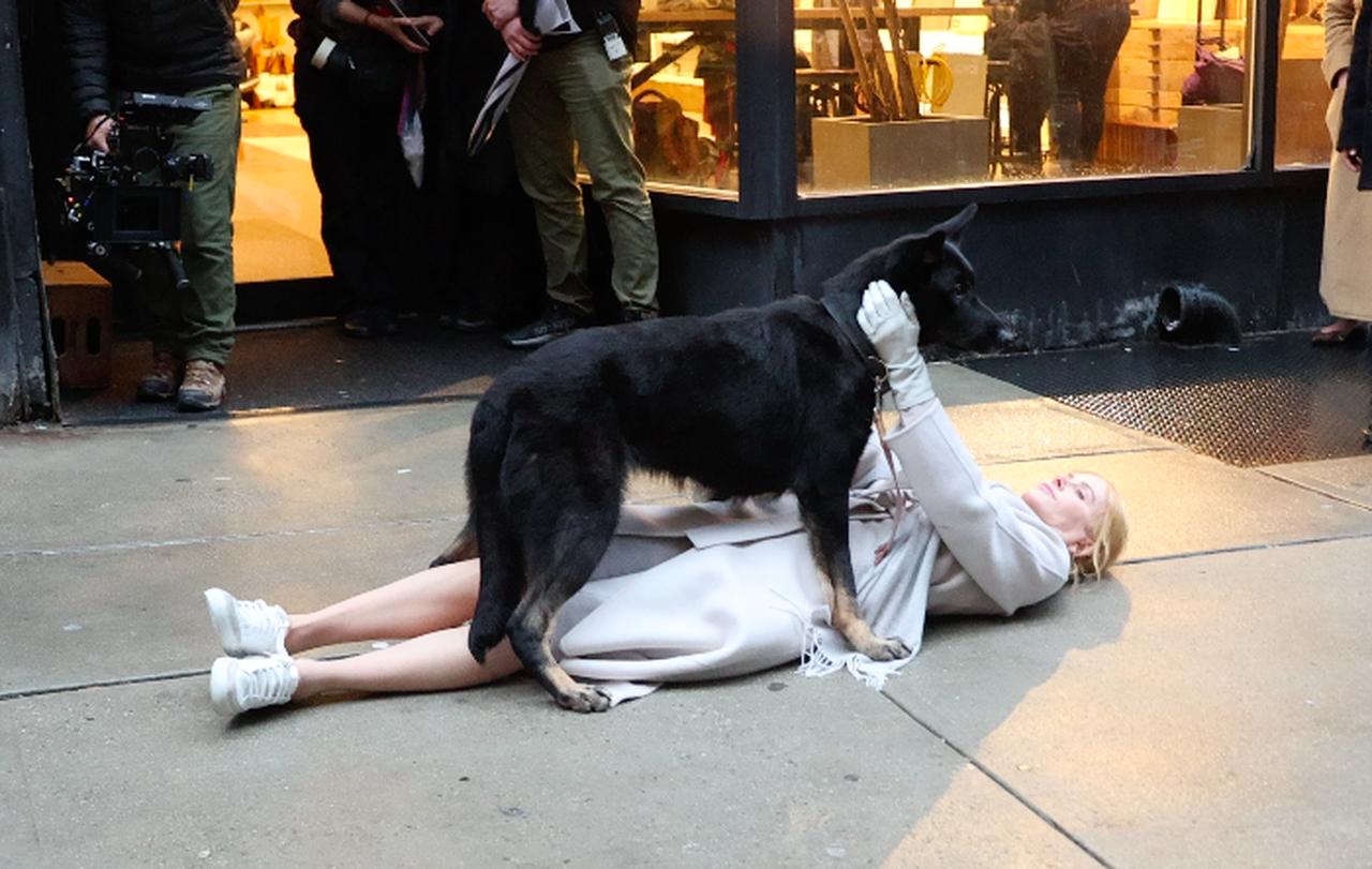 この撮影には犬も参加しており、転んでしまったニコールの上には大きな犬が。