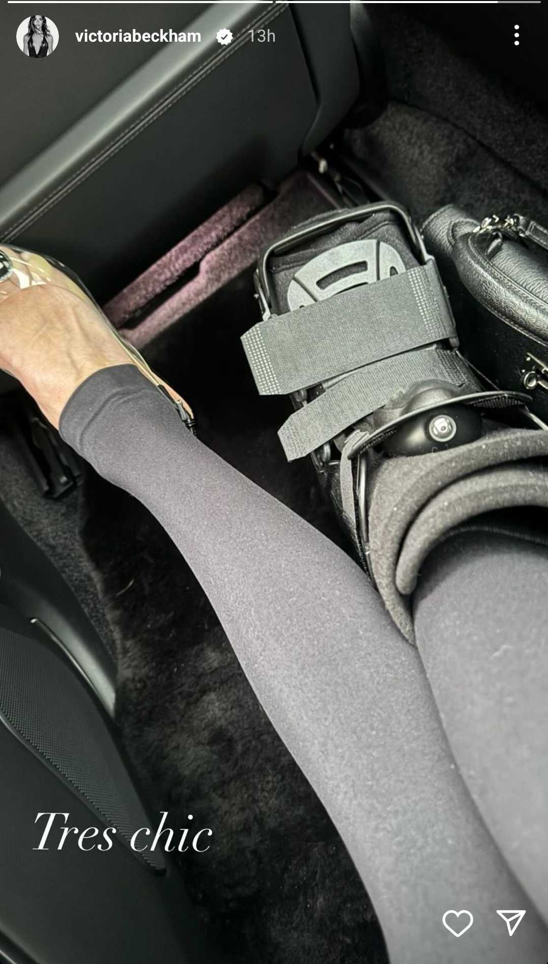 普段ほとんどハイヒールを履いて生活していたヴィクトリアが骨折後はどうするのかと思われたが、そのスタンスは変わらず。骨折した左足にはギプスシューズを履き、右足はハイヒール生活している。