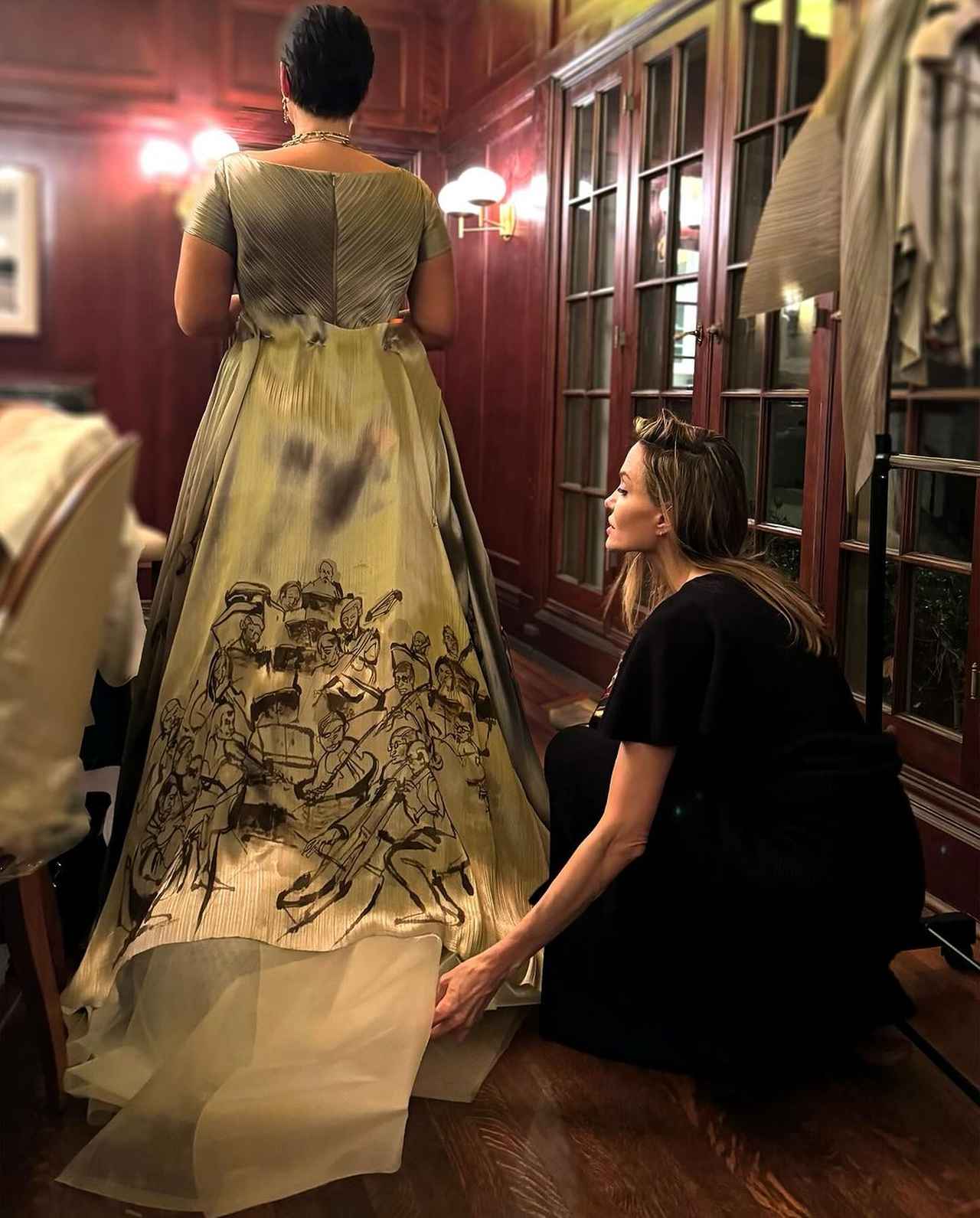 スレイカは「私のガウンは唯一無二のアンジェリーナ・ジョリーがデザインし、シルクに『ジョン・バティステ:アメリカン・シンフォニー』から影響を受けた絵を素晴らしいアーティストであるチャズ・ゲストが描いて完成させてくれました」とインスタグラムでアンジェリーナがデザインしたと紹介し、フィッティングの様子も公開した。