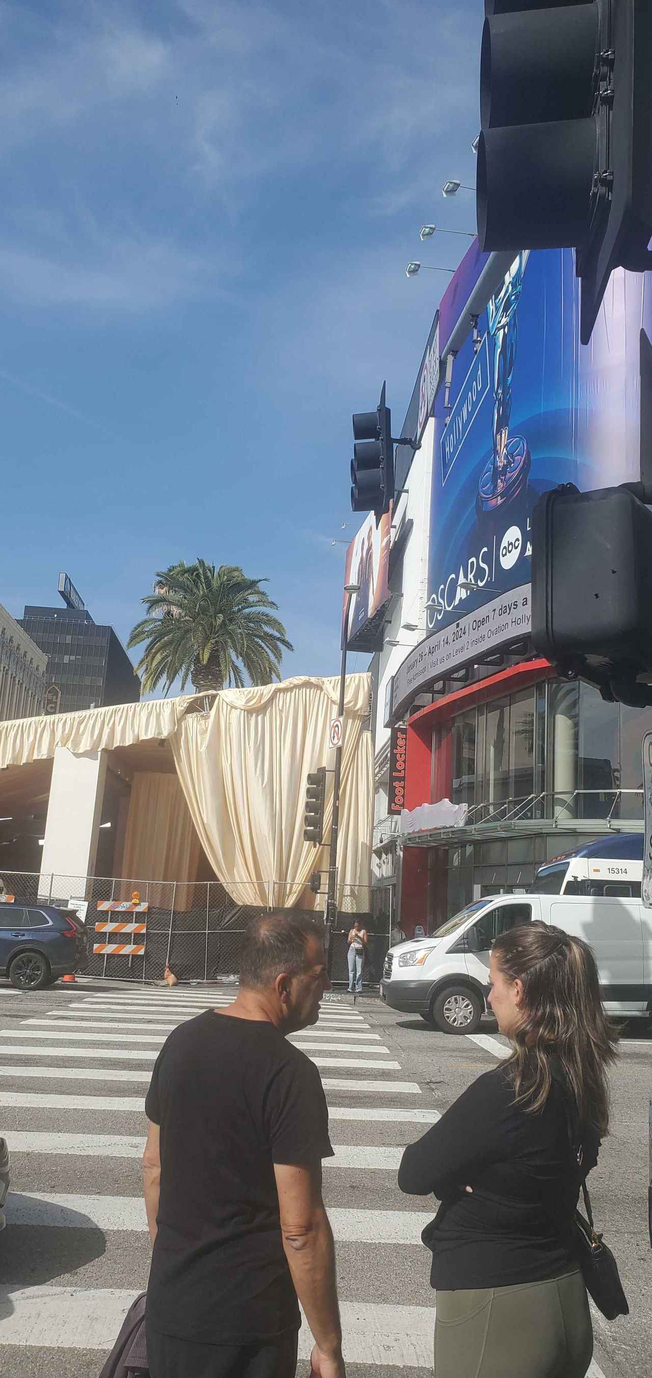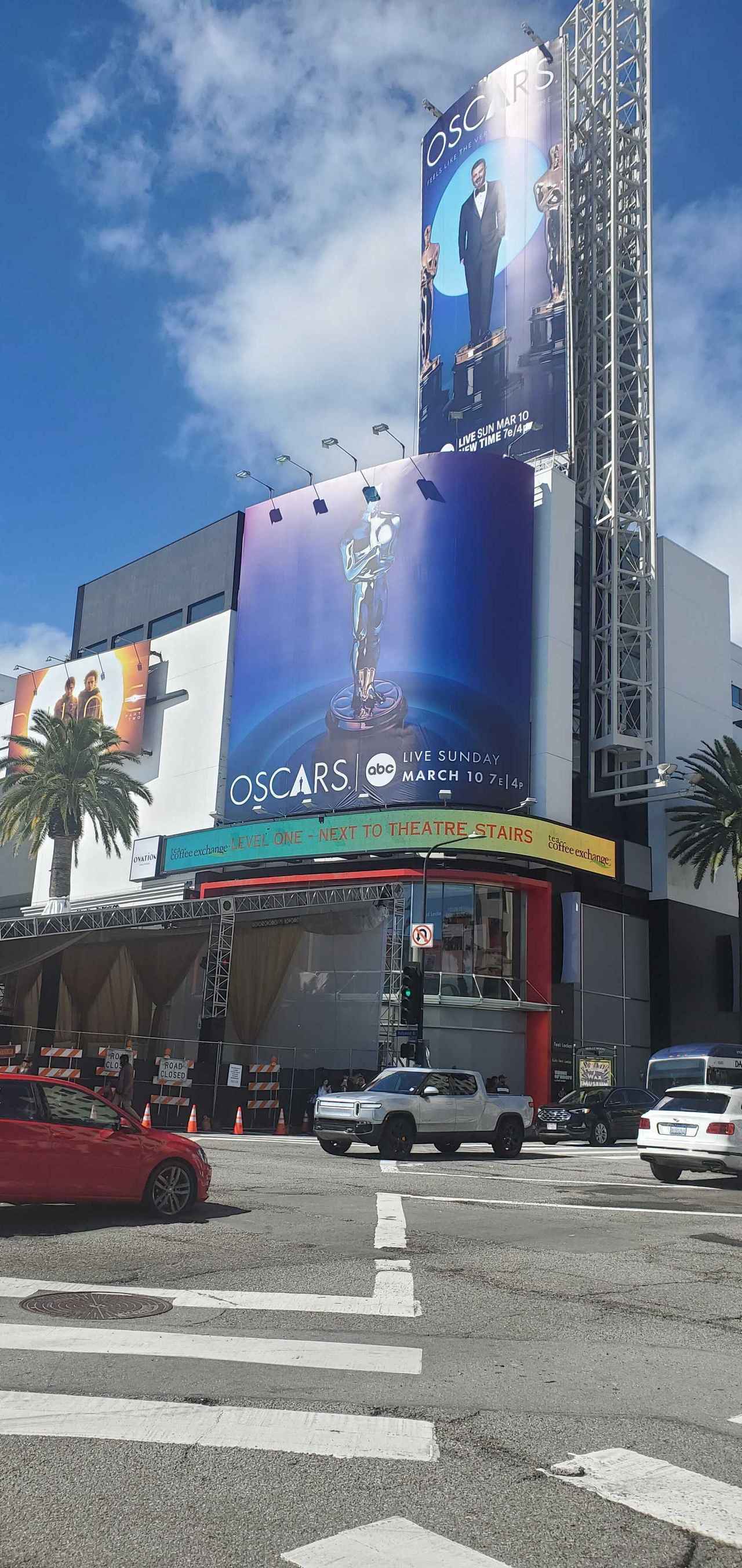 アカデミー賞授賞式が行なわれたドルビーシアターは、普段は観光客が多く訪れるハリウッドの大通り沿いに位置している。授賞式が近づくにつれ、ドルビーシアター付近には司会を務めたジミー・キンメルやオスカー像がデザインされた広告が出没。