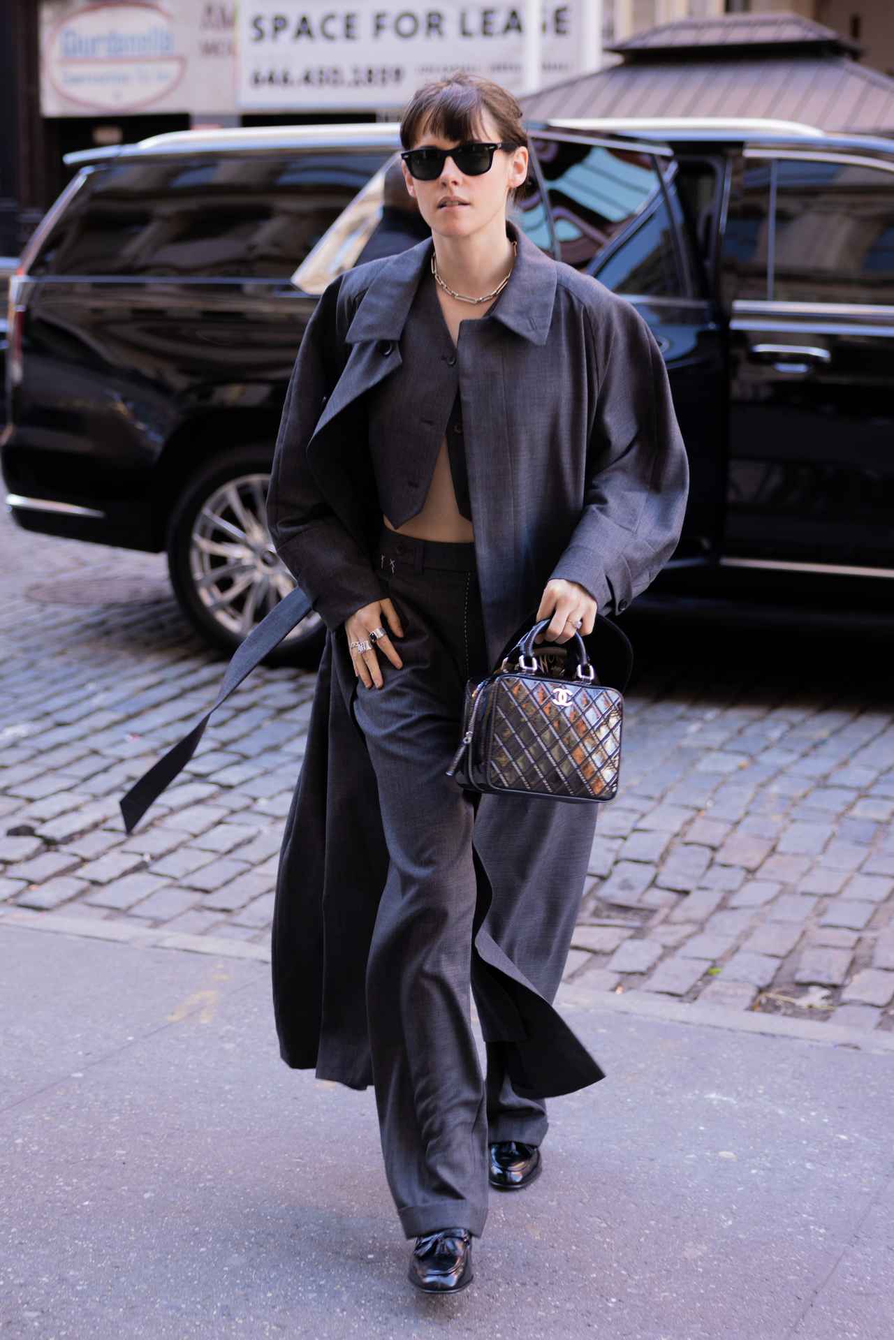 全体をチャコールグレーでまとめたこの日のスタイリング。インナーのベストは一番上のボタンだけ閉め適度に肌見せして抜け感を出して。