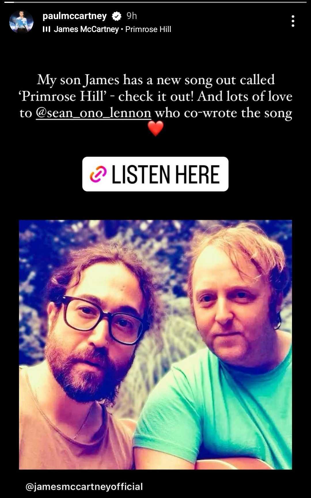 ジェームズとショーンのコラボ作にはポールも反応しており、自身のインスタグラムで「僕の息子であるジェームズが『Primrose Hill』という曲をリリースしたのでチェックしてみてください!そしてこの曲を一緒に作ったショーンへたくさんの愛を」とコメントして息子の楽曲を宣伝した。