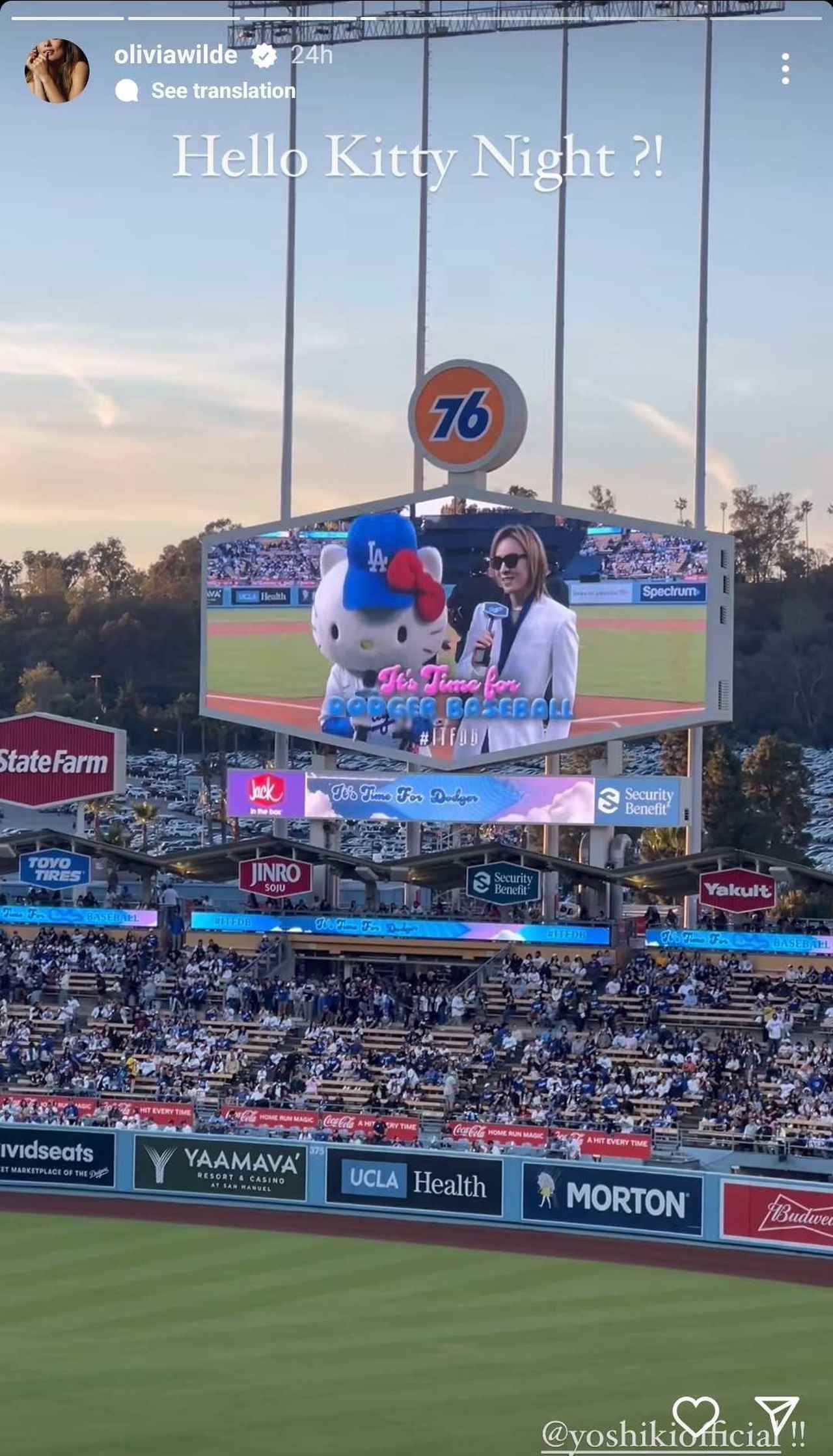 俳優のオリヴィア・ワイルドが、ドジャースの試合に参加。この日はハローキティ・ナイトだったようで、ヨシキティをパシャリ。(フロントロウ編集部)