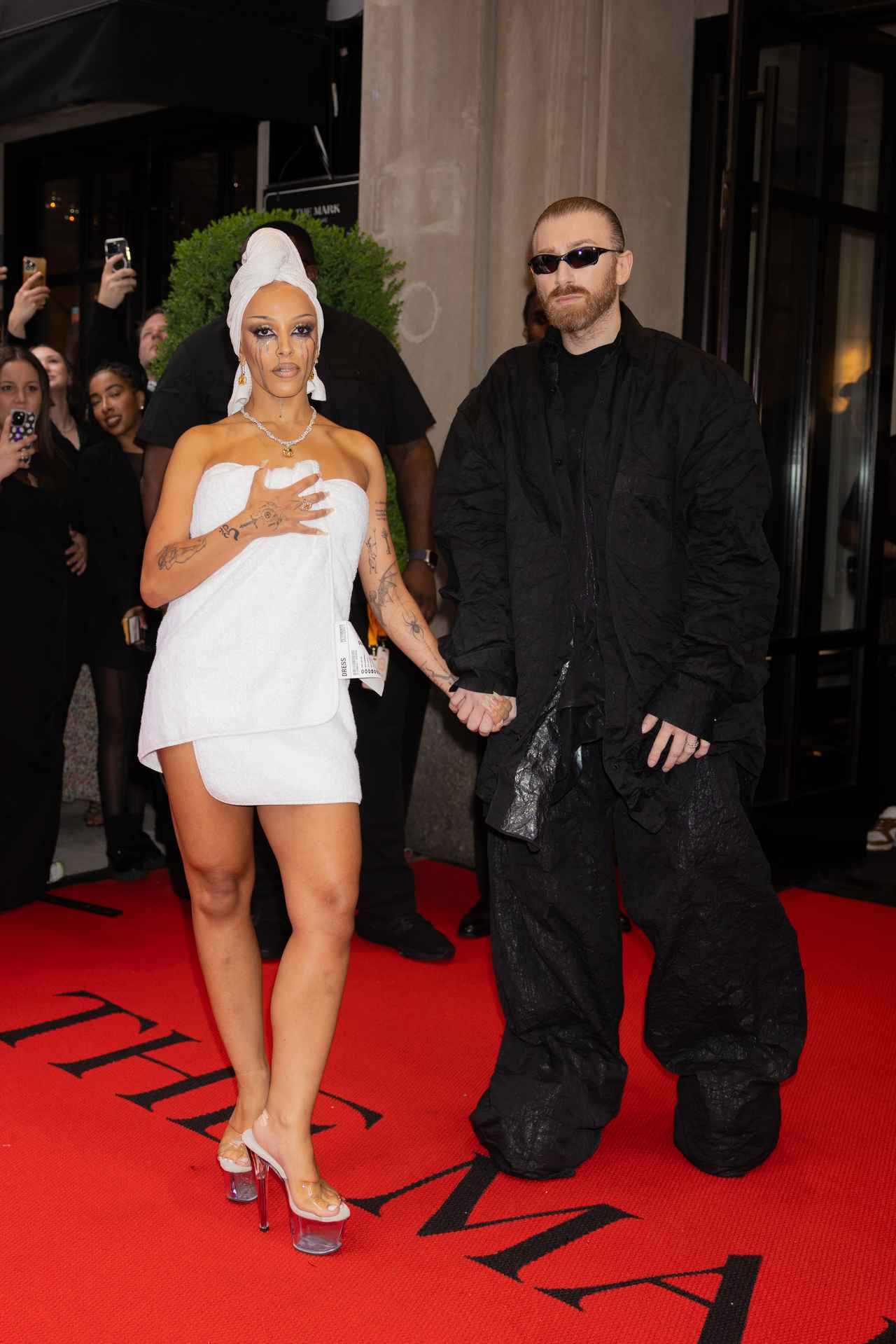 ドージャがホテルから出た際に着用していたのは、なんとバスタオル風の“ドレス”。こちらは隣にいる、グラム・ヴァザリアがデザイナーを務めるヴェトモン(Vetements)のもの。どこからどう見てもバスタオルなのだが、タグには「ドレス」と書かれている。