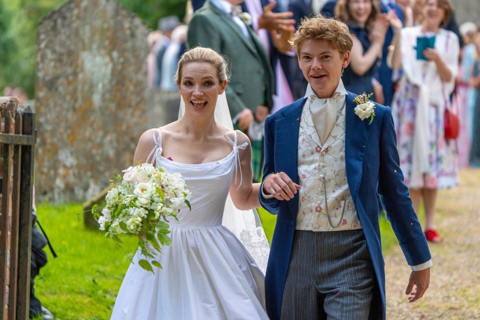 そんなトーマスとタルラが約1年の婚約を経て結婚。2人はセント・ジョージ教会で結婚式を行ない、タルラはクラシックなボールガウンスタイルのウエディングドレスを、一方のトーマスはブルーのロングテールコート、グレーのピンストライプのパンツ、クリーム色の花柄ベストのスリーピーススーツを着用し、まるで映画のワンシーンのようだった。