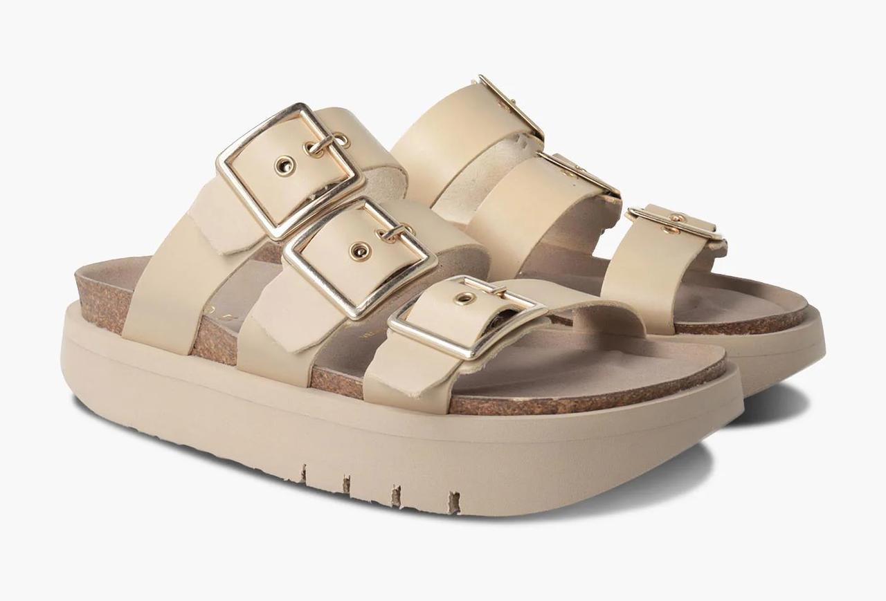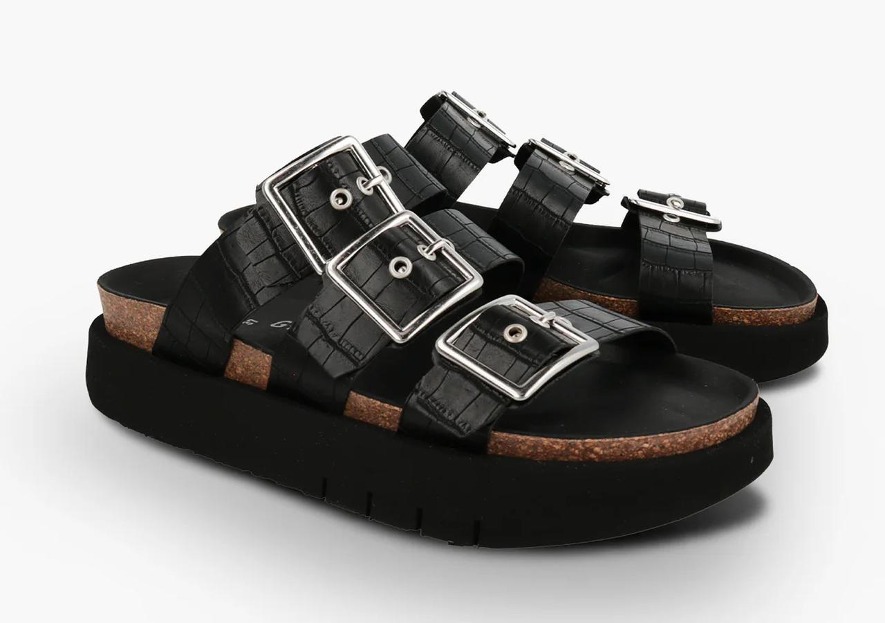 3本のストラップと大きめのバックルがポイントのプラットフォームサンダル。サンドカラーのストラップにはスムースレザー、ブラックのストラップには型押しを施した合成皮革を採用。ソールハイトは約3.5cm。