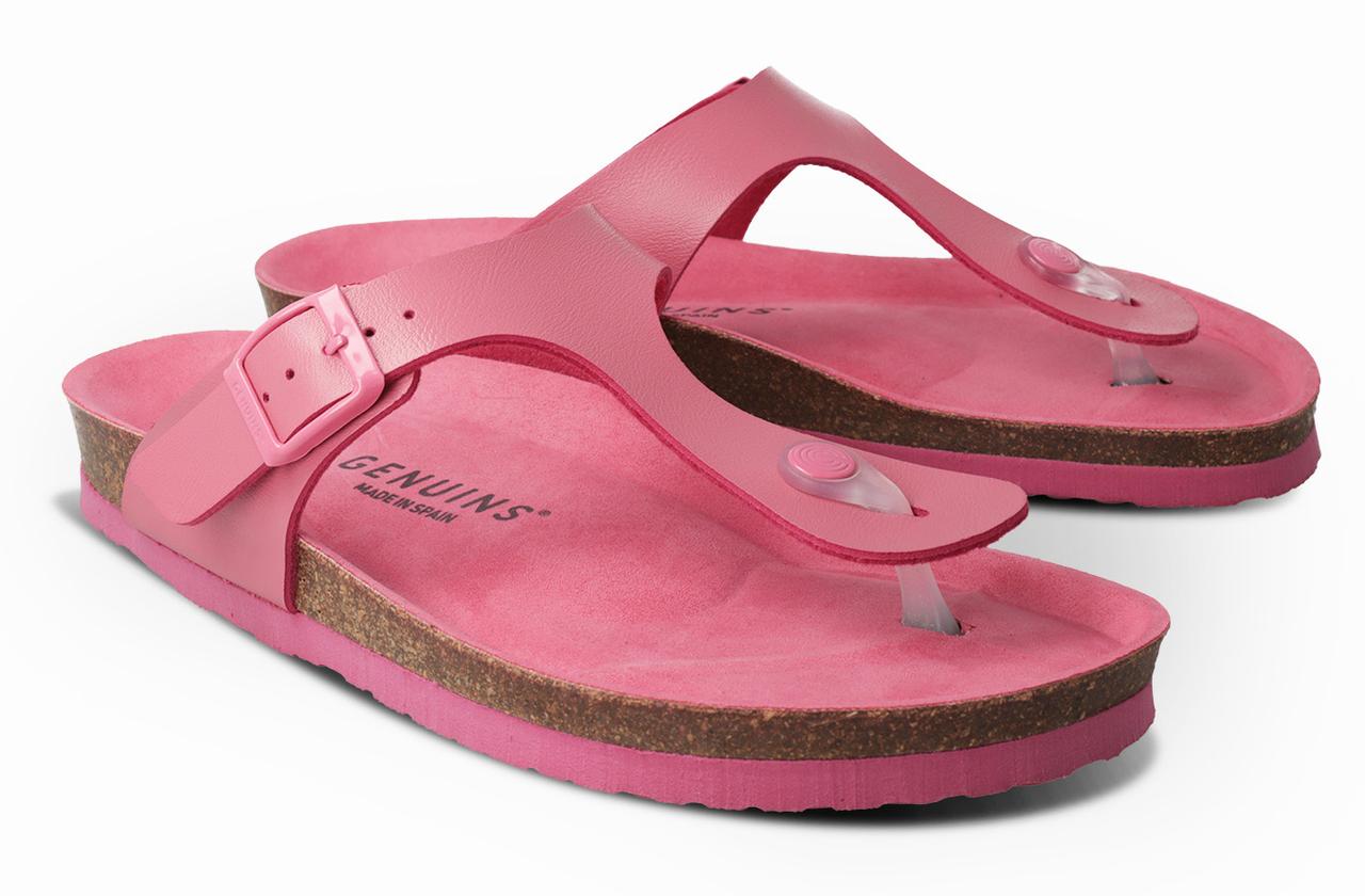 ビビッドピンクなトングタイプサンダル。アッパーには環境に配慮した合成皮革を使用。