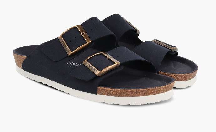 ヌバック調の合成皮革に100%天然のコルクを合わせたサンダル。ネイビー、コルク、ホワイトのトリコロールカラーが新鮮。