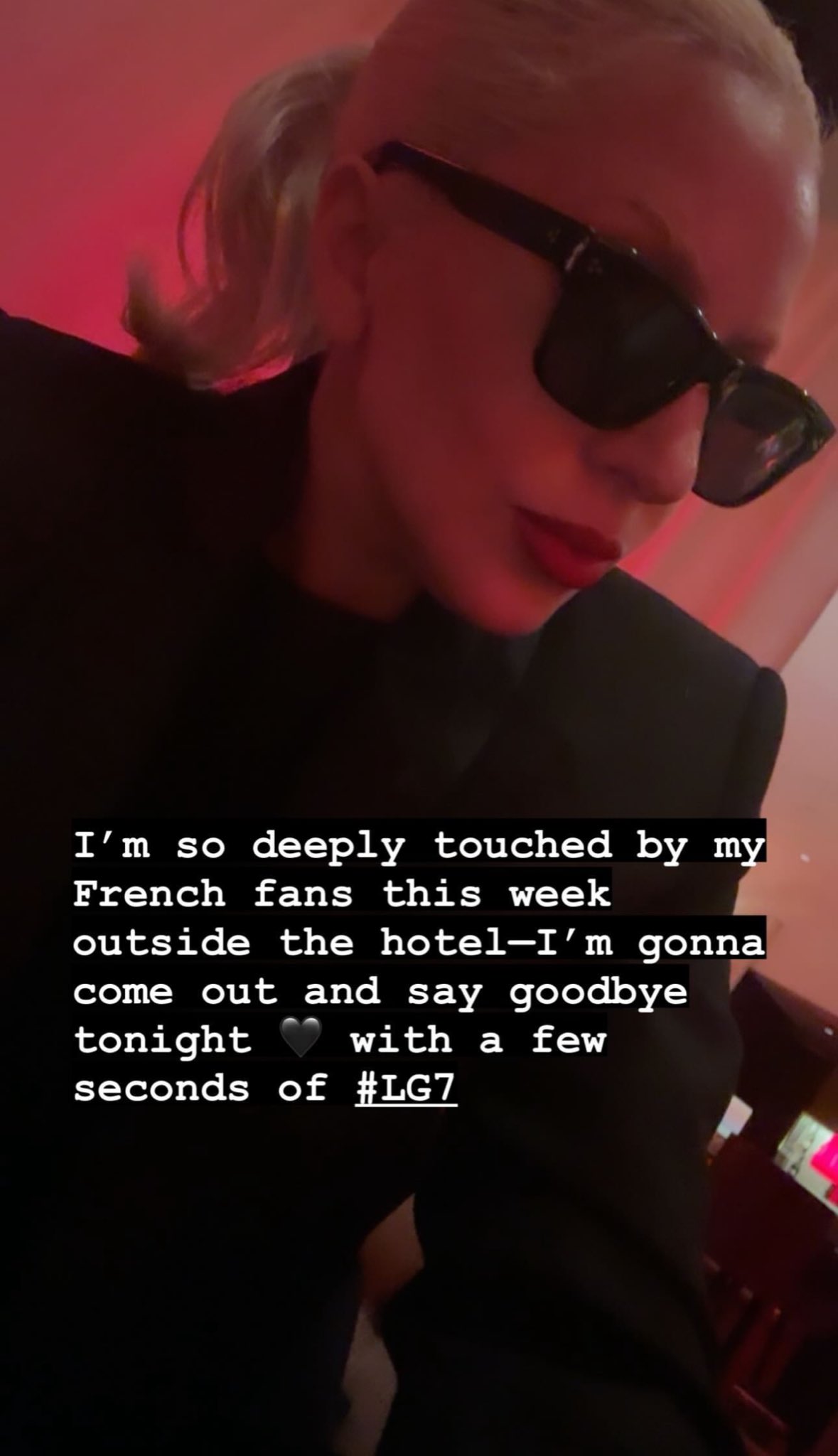 そんなガガはホテル前に集まったフランスのファンと連日交流を深めている。そしてガガがアメリカに戻る前に「今週ホテルの外にいたフランスのファンにとても感動しました。今日外に出てお別れを言いたいと思います。数秒の『LG7(レディー・ガガ7枚目のアルバム)』の曲と共に」と自身のインスタグラムにコメント。