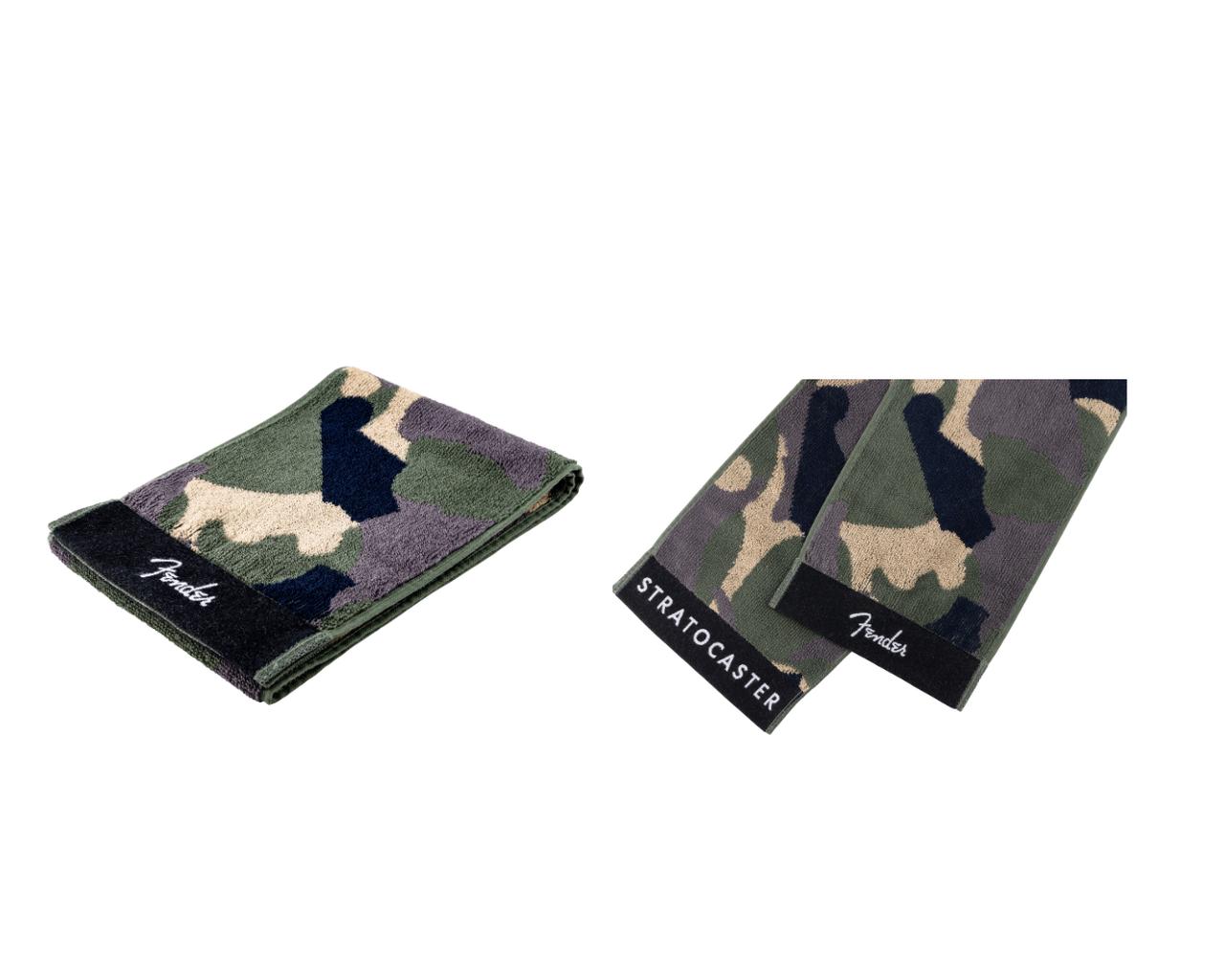 キャンピングチェアとタオル、どちらのアイテムにも共通するのは、今回Fenderがオリジナルでデザインしたユニークな“カモフラージュ柄”だ。この柄は、 Fenderのアイコン的ギターモデル「STRATOCASTER」のヘッドストック、ボディ、ピックガードのシェイプをカモフラージュ柄に落とし込んだ大胆なデザインとなっている。