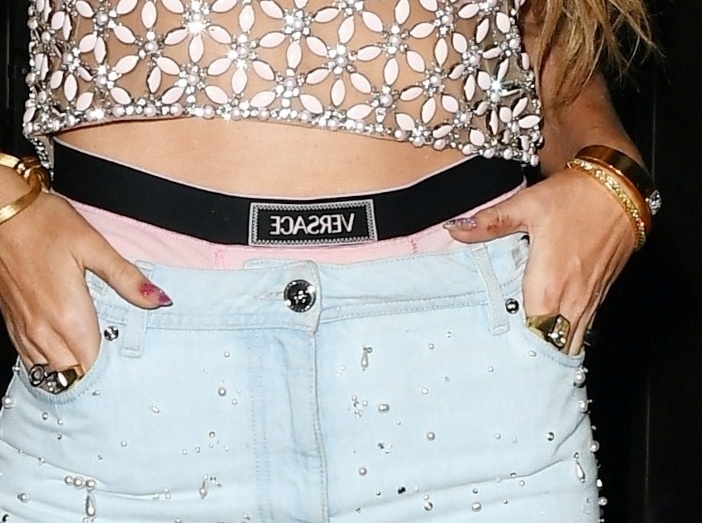 トップスとデニムについたビジューがキラキラと輝くナイトアウトスタイルで2日間登場したのだが、この2日のコーデにほんの少しだけ違いがあるのに気づいた?ヒントはデニムの下に履いているヴェルサーチェ(Versace)のパンツ。