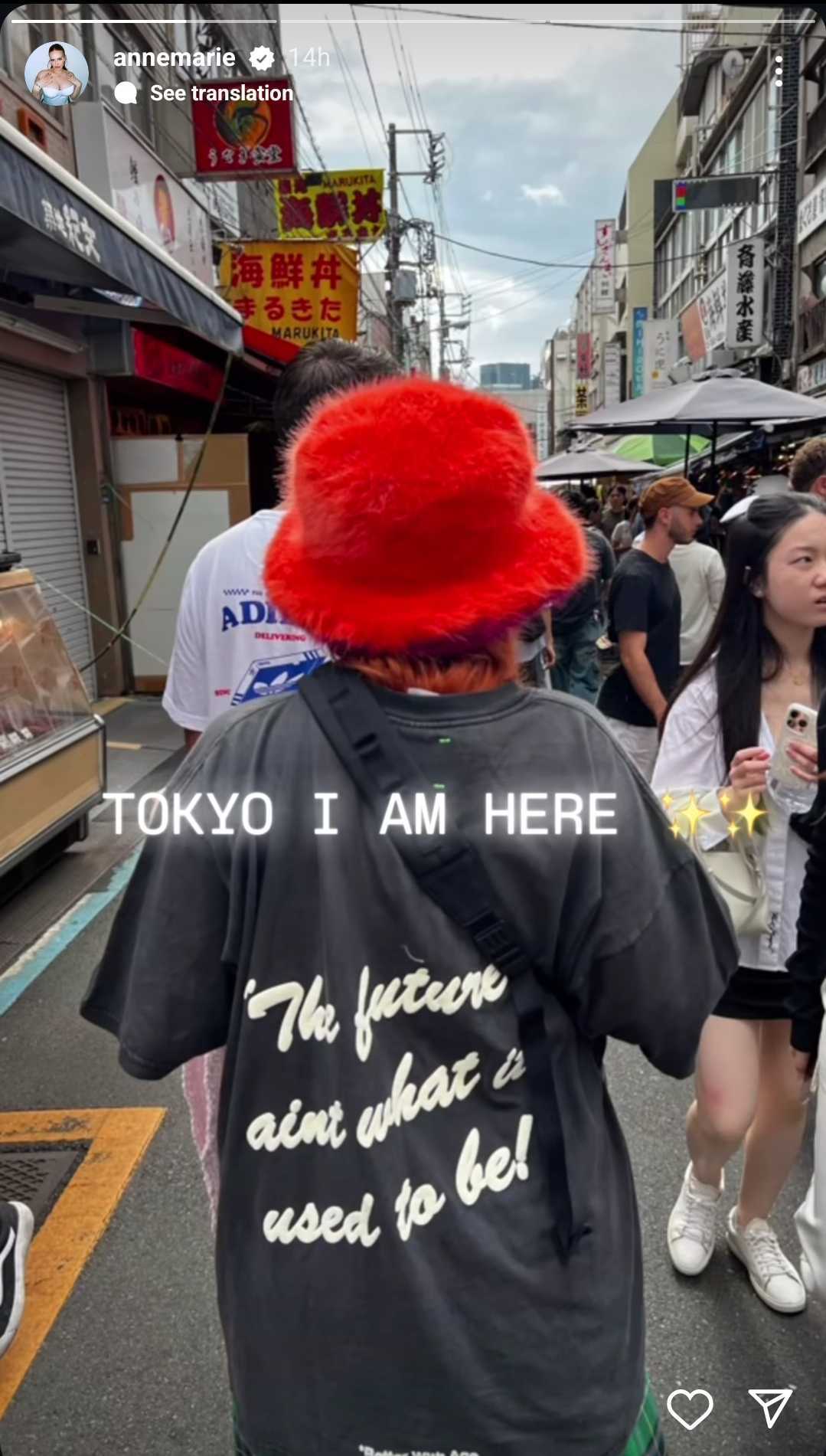 今回アンが訪れたのは築地。商店街を歩き回っていたアンは、目を引くオレンジのモヘアハットにオーバーサイズTシャツを着用し、ファッショニスタらしい一面を見せた。
