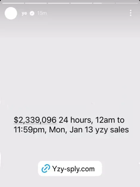 カニエは全てのアイテムを20ドル(約3,100円)で売っているのだが、1月13日の午前12時から午後11時59分までの間に自身のオフィシャルサイトで2,339,096ドル(約3億6,000万円)を売り上げたとインスタグラムで発表。さらに1月14日の午前12時から午前6時までの間に70万ドル(約1億円)以上売り上げた。売り上げの内訳は発表されていないが、主にフットウェアだと言われている。