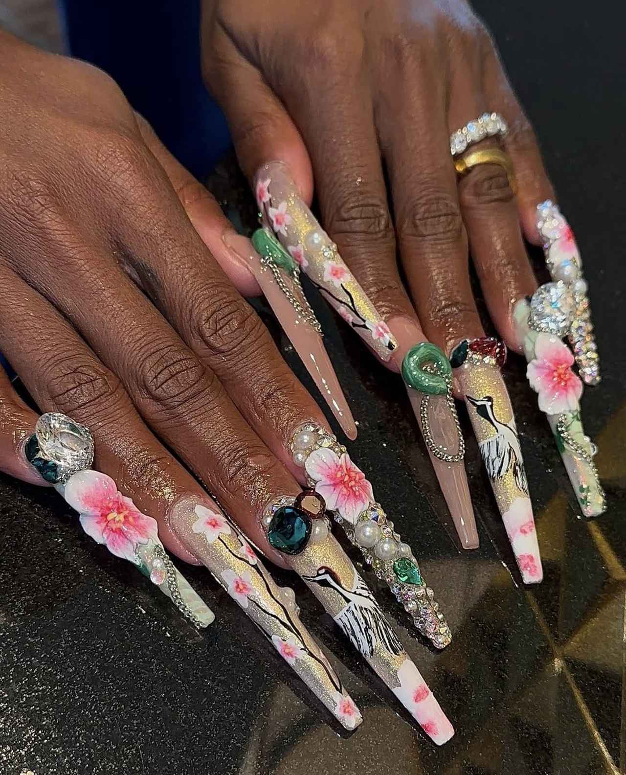 今回日本でのプレミアということもあり、シンシアのネイルは日本仕様に。桜や鶴がデザインされたロングネイルは、日本だけの特別なネイルだった。