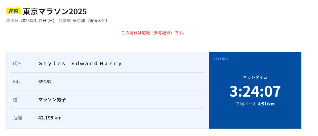 東京マラソンのサイトにはランナーのゼッケンナンバーを入れるとその人の記録を見ることができるのだが、ハリーがつけていたゼッケンナンバーを入れてみると、しっかりとハリーの名前が。そして3時間24分7秒でフルマラソンを走り切った。