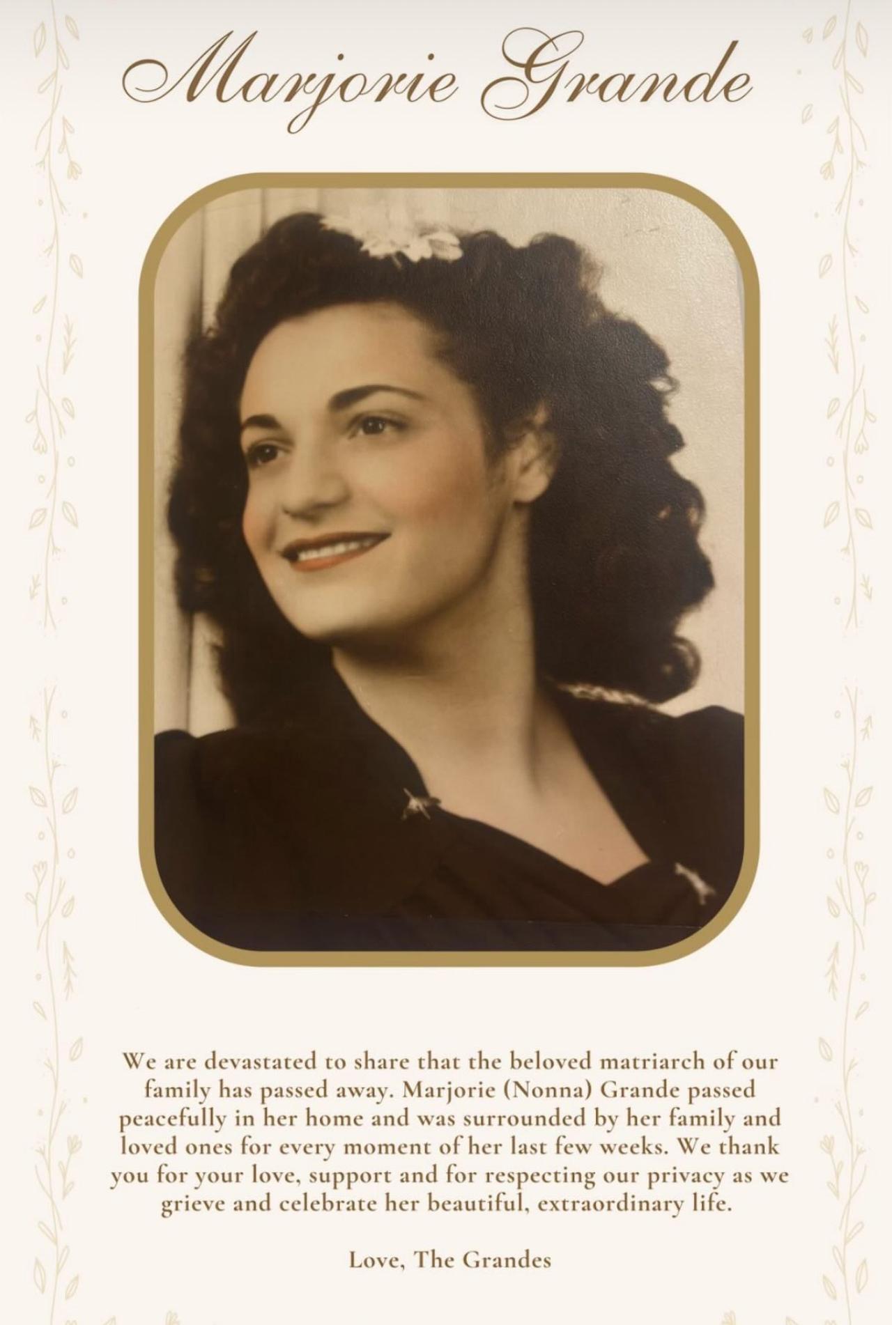 シンガーとしてだけでなく、映画『ウィキッド ふたりの魔女』に出演し俳優としても活躍しているアリアナ・グランデの祖母マージョリー・グランデが亡くなったことがアリアナのインスタグラムで発表された。