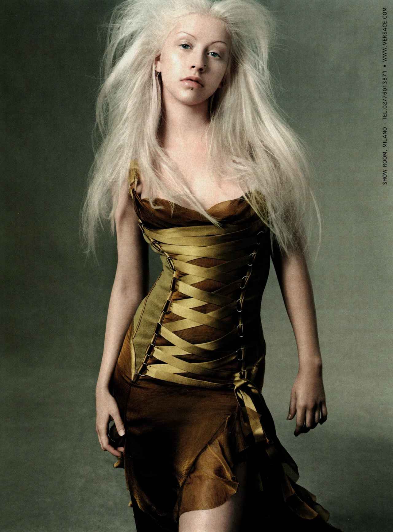 スカート部分がアシンメトリーになったこのドレスに黒のブーツを合わせエッジが効いたスタイリングを披露したクリスティーナ。じつはこのドレス、今から20年以上前にクリスティーナがヴェルサーチェの広告で着用したものと全く同じ。